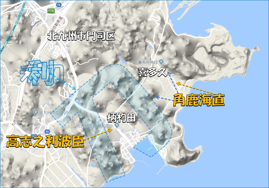 …「擦り潰されたように押し拡げられた山稜の端でなだらかに切り分けられた三角州」と紐解ける。「日子」=「[炎]の地形から生え出たところ」であって、三角州の先にある小高いところに坐していたのではなかろうか。残念ながら九州自動車道の北九州JCT付近となっていて詳細を読取ることは不可であるが・・・。